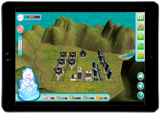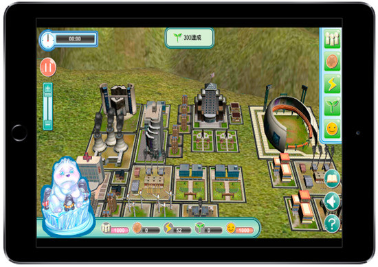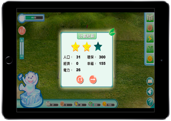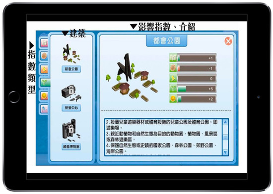 The contents of this game are mainly for the construction of buildings to maintain the balance between urban development and construction and environment. Each building, as illustrated in Table 2, enables learners to understand the environmental impact of each construction and the principle of renewable energy. The main content of the teaching activities centers on destruction to the environment that arises from over-exploitation as well as the importance of advocating environmental protection. Learners will play the role of builders in the game. In the process of construction and development, the environment will drop in value. In this regard, green buildings must be constructed to improve the environment. The construction of green buildings will also cause economic decline, and learners need to maintain a balance between the two. In terms of the main playing of the game, construction may be divided into five categories: population, economy, electricity, environment, and happiness (Table 2). In the process of construction of the population, economy, and electricity, the quality of environment will be affected, representing destruction of the environment. Hence, efforts should be made to build environmental buildings or build buildings with renewable energy to improve the environment. However, environment-based construction will affect economic development. Players must find ways to strike a balance between economy and environment to learn the impact of technological development and environment.