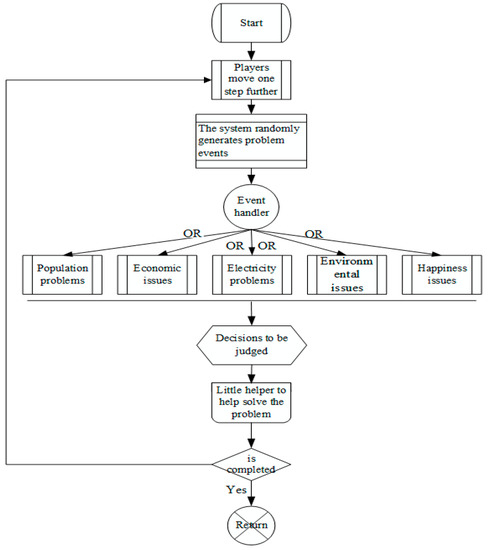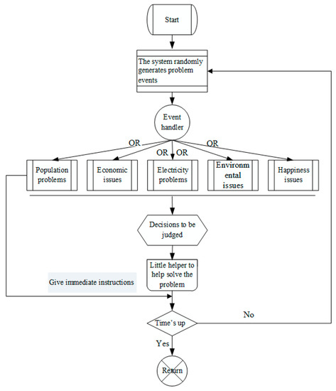 The operation procedure of the environmental education simulation real-time strategy game is shown in Figure 6 and Figure 7. Since this game is based on real-time decision-making under the development of sustainable environmental education based on the five dimensions of population, economy, electricity, environment, and happiness, any event will happen immediately and players must decide to handle which incident immediately to response and solve the problem. For example, in terms of environmental problems, if there is a lack of power infrastructure in urban development, then there are five sources of electricity (nuclear, wind, waterpower, thermal, and solar power) available to players. However, the source of nuclear energy selected by players will lead to a negative impact on the environment and gradually reduce the environmental health index. Players need to instantly determine whether to develop an economy or create a happy city. If players choose wind power, though this can avoid a decline in the environmental health index, the cost at the same time will result in a decrease in the economic index. If the economic indicators continue to decline to a certain level, then this will lead to social happiness and public order problems and even to social theft events. The social stability index will at the same time also gradually decline. At this moment, players should immediately send the police to maintain social order, thus raising the social stability index. Players need to invest in green alternative energy after achieving an economic balance. Though the economy index will decline, and the social stability index will also drop due to investment in alternative energy sources, the environmental index will go up. The five indices of population, economy, electricity, environment, and happiness will also change. After the game is over, for a limited time, the system will calculate the balance value of players in population, economy, electricity, environment, and happiness, as their results. Figure 2, Figure 3, Figure 4 and Figure 5 illustrate the operation chart of a sustainable environmental education strategy game.