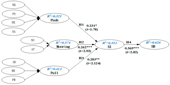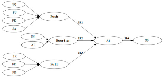 Media Richness Theory, also known as Information Richness Theory [42], defines the richness of information as the potential information load of media. In terms of consumption decision, it has been pointed out that whether to obtain rich information is an important factor that influences the intention of consumer behavior [43]. If consumers are equipped with enough useful information during the consumer decision-making process, then their purchase attitude will be more positive. Rice (1993) argued that different media have different characteristics and different media have different communication effects [44]. Dennis and Kinney (1998) used computers as a medium of communication, as they can immediately provide feedback, transmit multiple clues, and use multi-lingual communication and individual focus [45]. When users perceive the richness of the medium of an information system, their perceptual entertainment will be positively affected [46]. Dialogues between information systems and users, in addition to interaction between both sides, can respond to information and content provided by information systems [47]. Interactivity has a positive impact on the practicality of information systems and helps create better consistency between attitudes and usage behavior [48]. Ennew, Banerjee, & Li (2000) pointed out that a company’s reputation has a greater impact on consumer behavior than advertising and personal marketing and even plays an important role in the diffusion of new products. Hence, reputation also has a direct impact on consumers’ willingness to switch or buy. Lee (1966) even found that migration pull would be produced if there was better quality of life in the process of migration [49]. As a result, service providers and consumers with higher subjective norms, higher information richness, and good reputation feel stronger intention about switching. From the above literature, the effects of pull as a substitute include information richness, reputation and trust, perceptual risk, switching intention (SI), and SB. Therefore, this study proposes the following hypothesis.