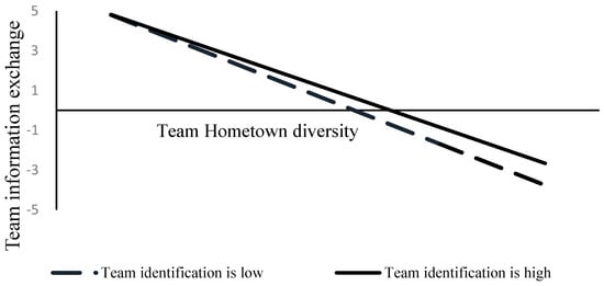 On the other hand, when team members identify their team, they are likely to identify the team culture and team goal. From this perspective, they can exchange their experiences and information effectively since they clearly know team goals []. In this paper, we argue that team hometown diversity would be negatively related to team information exchange in H1. Accordingly, we propose that the negative relationship can vary under different circumstances. When team identification is high, team hometown diversity impacts on team information exchange in a less negative way than when team identification is low. By realizing that they shared the same identifications for the company [], employees tend to view the divergence of demographic diversity as less important than the same identity [] and are more willing to enhance team information exchange []. In contrast, when team identification is low, effective communication would take place in smaller communities where they own similar attributes, such as language or code. Thus, we hypothesize that:
