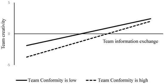Conformity refers to the restraint of actions, inclination, and impulses likely to upset and harm others or violate social expectations and norms [] (p. 705). Conformity is the value of guiding attitudes and behaviors in situations [] and may influence the information exchange and creativity. The definition of conformity implies adherence to norms, unwillingness to be different [], and reluctance to engage in creative behavior [], which suggests that the relationship between team information exchange and team creativity varies when team conformity varies: when team conformity is high, team members are not inclined to object to the others’ different views and adopt new ideas since they are not willing to offense others, which is detrimental for the team creativity. In other words, team conformity may contribute to replication of established procedures but not be a beneficial practice for creativity [,].