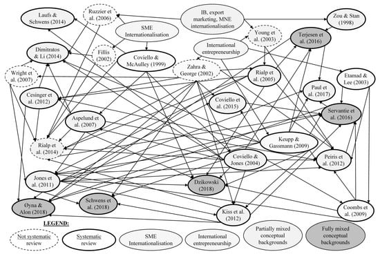 Figure 1 displays a network of topics and review articles based on an extensive review of the 27 articles identified. The arrows indicate which review articles made reference to which other review articles in defining the scope, methodology or starting point of their reviews, or included them in the set of papers reviewed. The articles are classified as either systematic or non-systematic and based on the conceptual area of the antecedent papers, divided into theoretical thematic groups: international entrepreneurship, SME internationalization or mixed conceptual backgrounds. Those articles that referenced more than one of these conceptual backgrounds were also labelled as partially mixed background articles. Those studies whose antecedents were only articles with mixed backgrounds were termed fully mixed and highlighted in the diagram in a different shade. This differentiation serves the purpose of illustrating the convergence of the conceptual domain in international entrepreneurship and the development of a unified framework based on an initially more fragmented conceptual background. This network of articles may provide evidence for the patterns identified in the domains of management [], medicine [] and other sciences [] in terms of the hierarchy of evidence and aggregation of knowledge by means of systematic reviewing, to be valid for international entrepreneurship. The citation numbers give a quantitative basis for identifying key trends and patterns in terms of how the review articles relate to each other through backward and forward references.