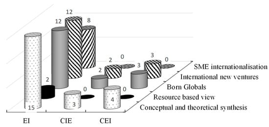 Conceptual and synthesis driven literature has progressed over time. Review studies converged between the antecedent fields of research resulting in review articles incorporating mixed theoretical backgrounds. Zahra and George (2002) [] constructed an integrated model of international entrepreneurship consisting of (1) organizational, (2) environmental and (3) strategic factors, supporting (4) international entrepreneurship, leading to (5) competitive advantages. Rialp et al. (2005) [] and Coviello and Jones (2004) [] were the first authors to provide systematic reviews of the domain combining articles from international entrepreneurship and SME internationalization. Peiris et al. (2012) [] extended the scope of concepts by adding the importance of networks to this model. Kiss et al. (2012) [] confirmed the applicability of these concepts in emerging markets.