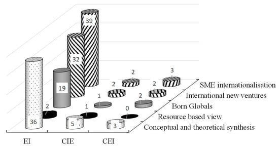 The authors provided extensive arguments supporting the notion that international entrepreneurship is a distinct theoretical area [,]. Theoretical antecedents were identified from international business: environment, institutional and network theories, multinational enterprises and subsidiaries, exporting, Uppsala, OLI and TCE frameworks, transaction cost theory, psychic distance and emerging market studies [,,] and entrepreneurship: opportunity evaluation, entrepreneurial orientation and entrepreneur social capital, human capital and other characteristics, firm attributes [,]. Jones et al. (2011) [] identified three domains of international entrepreneurship (entrepreneurial internationalization, comparative entrepreneurship studies and comparative international entrepreneurship). Servantie et al. (2016) [] categorized the body of international entrepreneurship research into five fields, namely SME internationalization, international new ventures, born global firms, the resource-based view and literature on conceptualization and theoretical synthesis. Articles in the domain of international entrepreneurship can be classified by the typologies of Jones et al. (2011) [] and Servantie et al. (2016) [] to provide a map in the coverage of literature within the areas already identified as part of international entrepreneurship. Figure 2 provides an overview of the classification of the 27 review articles according to these dimensions, based on the results of the thematic analysis conducted.