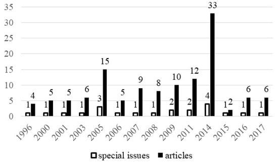 Special issues play a particularly important role in disseminating knowledge of management and organizational scholarship. Special issues augment the citation numbers of articles in less prominent journals, enabling these studies to be more impactful []. These articles get more citations generally than regular issue ones []. Special issues seek novelty and breadth of published research, and have higher potential to interact with the world of practitioners through their ability to capture novelty []. They often encourage researchers to submit articles that otherwise would not be devoted to publication, thereby extending the frontiers of research and the dissemination of the results []. Special issues also have a positive impact on the acceleration of knowledge development and reduce the time required to publish papers []. Therefore, we seek the validation of trends and analytical dimensions extracted from the surveyed studies by systematically reviewing special issue articles in international entrepreneurship.