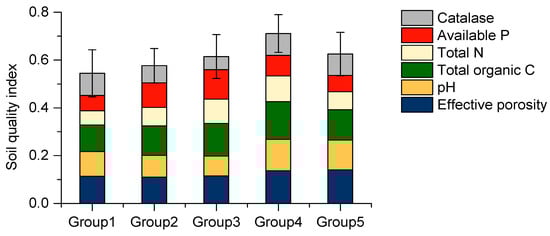 Weighted soil quality indices using minimum data set as determined by principal component analysis for each group of sampling points in the Lhasa River valley. Vertical bars represent standard errors from the mean soil quality index values for each group. Group 1 to Group 5 represent the groups of sampling points divided by soil types and land use types as described in Section 2.3.