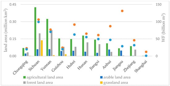 Overall, Table A3 in Appendix C shows that the dominant land-use type in the YREB is agricultural land accounting for 84.01% of the total land area, which significantly contributes to the spatial heterogeneity in water footprints of the 11 YREB provinces. As reflected in the proportions of agricultural land relative to total land in different YREB provinces, their urbanization levels follow an increasing trend from upstream to midstream regions and, then, downstream. Comparing agricultural water footprints before and after optimization in the scatter plots in Figure 5, we can see that all 11 provinces experience a decline, but there exists a significant spatial difference in the magnitude. In general, the four upstream provinces on the left in Figure 5 experience the smallest decline followed by the next three midstream provinces in the middle in Figure 5 and, then, the rightmost four downstream provinces in Figure 5 with the largest declines. The optimized agricultural water footprints show a strong positive correlation with the agricultural land area of the 11 provinces with a correlation coefficient of 0.899, which increases from 0.425 before optimization. This shows that the lexicographic minimax allocation scheme puts a reasonable restriction on the agricultural water footprints and contributes to the spatial distribution of agricultural water resources. Although the amount of optimized agricultural water footprints varies significantly across the 11 provinces, their proportions relative to the total optimized water footprints in each province show a remarkable consistency with a small standard deviation of 0.161. This indicates that this allocation scheme helps to ensure spatial equity from a land area perspective. Next, given agricultural land’s significant contribution to water footprints, we further analyze how different agricultural land-use types contribute to spatial heterogeneity of provincial agricultural water footprints (Figure 5).