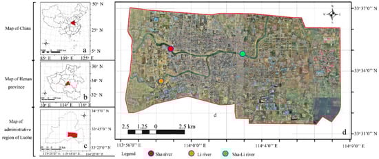 Study site (Luohe city); (a) the location of Henan province in China; (b) the Luohe administrative region within Henan province; (c) Luohe city within the Luohe administrative region; (d) classified unmanned aerial vehicle (UAV) imagery of Luohe city, illustrating the core city area surrounding the confluence of two rivers.