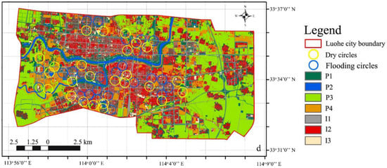 Land use and land cover classification from UAV data, with observed chronic flooding points (in green, top). The overlap among 750 m diameter circles (flooding and dry) was 6.5% (bottom). Key to legend: P1 = open space (green space, lawns, wood lots, forest); P2 = water areas; P3 = cultivated land (crop cover, pasture); P4 = unimproved areas (bare soil, construction site, no vegetation); I1 = streets and roads (driveway, pavement, open ditches); I2 = roofs; I3 = comprehensive public venues (commercial plaza, park square, paved parking lots).