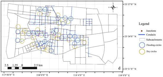 Subcatchment and pipe network division with a) flooding circles, and b) dry circles. (Subcatchments and arrangement of municipal conduits are referenced from the status map of urban drainage from Overall Urban Planning of Luohe city (2012–2030)).