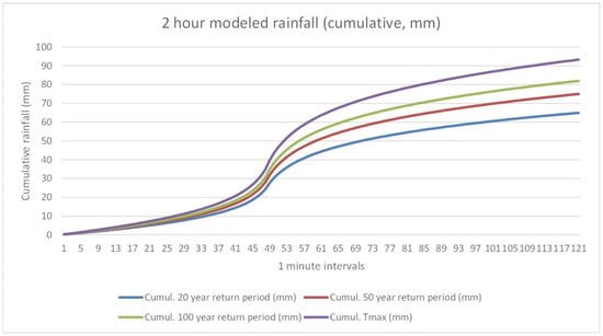 We used rainfall intensity formula curves (from 1980 to 2013) to simulate a generalized rainfall depth (mm) (Luohe City Municipal Engineering Design Institute, 2014). The rainfall prediction model assumes that the study area is small with consistent geographical and environmental characteristics, thus projecting a uniform spatial distribution for 24 h rainfall events with different return periods. []. Three return periods (20 years (T20), 50 years (T50), 100 years (T100)) were scaled against a maximum possible rainfall depth of 93.5 mm (Tmax) (maximum rainfall in past decade observed on July 17, 2010, between 12:30–14:30; Figure 4).