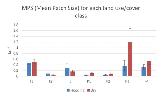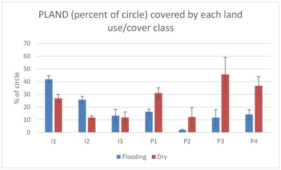 Landscape differences between chronic flooding circles versus dry circles, as related to mean patch size of roads (I1), roofs (I2), plazas and parking (I3), green space (P1), open water (P2), cultivated (P3), and unimproved/bare (P4). Black bursts indicate significant differences in means between flooding (blue) and dry (red) circles using Welch’s ANOVA (p < 0.05).