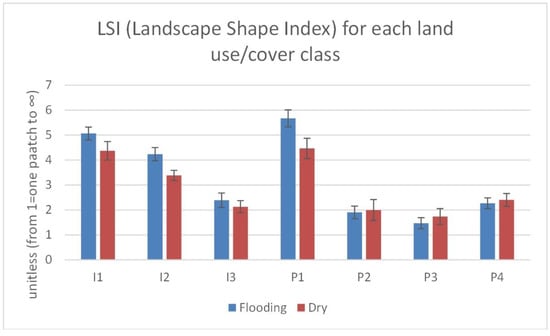 Landscape differences between chronic flooding circles versus dry circles, as related to the Landscape Shape Index metric measured for roads (I1), roofs (I2), plazas and parking (I3), green space (P1), open water (P2), cultivated (P3), and unimproved/bare (P4). * indicates significant differences in means between flooding (blue) and dry (red) circles using Welch’s ANOVA (p < 0.05).