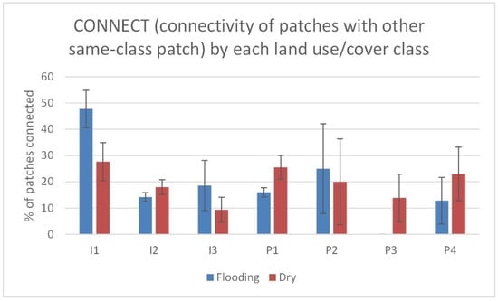 Welch’s ANOVA identified significant differences in the amount and configuration of permeable and impermeable land-use types between flooded and dry circles. Flooding circles had a higher percentage of land use in streets and roofs, and a lower percentage of land use in green space and bare areas (Figure 5). A measure of patch aggregation or clustering, the Landscape Shape Index of roofs and green space differentiated flooded and dry circles, with flooded circles displaying a greater aggregation of patches of roofs and green space than dry circles (Figure 6). The mean patch size of roofs was larger in flooded circles, and the green space patch size was, on average, smaller (Figure 7). The connectivity metric was not useful in distinguishing between flooded and dry circles for any land-use type, suggesting that green space connectivity is not as important as other configuration characteristics for flooding mitigation (Figure 8).