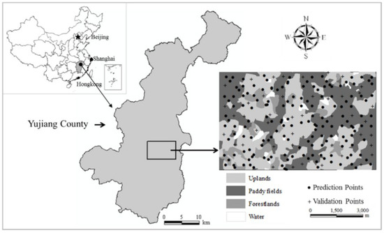 The study area (116°41′–117°09′ E, 28°04′–28°37′ N) is located in the middle area of Yujiang County, and covers a region of 40 km2 (8 km × 5 km). Situated in a subtropical, humid monsoon climate zone, the study area has a warm climate, abundant heat and sunshine, plentiful rainfall, and a long frost-free period. The annual average temperature is 17.6 °C, and the annual average precipitation is 1778.8 mm. Its frost-free period is approximately 258 days. The terrain in the study area is dominated by hilly and low mountains. Red soil (acrisols, WRB 2006) [28] is the most important soil type, and the main soil parent materials are red sandstone, quaternary red clay, shale, and river alluvium (Yujiang County, Jiangxi Province Soil Census Office, 1986) [29]. Paddy fields, dry land, and forestland are the major land use patterns. The main crops are rice, grains, sweet potatoes, peanuts, and sesames.