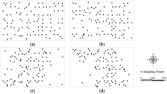 At present, remote sensing still cannot effectively reveal the distribution characteristics of regional SOC due to the detectability of SOC at certain thicknesses with the sensors available nowadays. Soil field sampling, laboratory testing, and point-to-surface expansion are still the main processes used to determine the spatial distribution characteristics of SOC [7]. In these processes, soil field sampling is the basic link for the follow-up actions. In recent decades, researchers have developed several soil sampling designs for regional soil investigation, including the simple random sampling design, the stratified sampling design, the systematic sampling design [7,8,9,10,11], etc. Because the design principles are different for each sampling design, the spatial distribution features of sampling points are distinctly different between designs. Based on statistical principles, the simple random sampling design randomly takes soil samples from the study area and can ensure that selection occurs without bias. In addition, some researchers have stated that this design can usually estimate the SOC distribution well [8,12]. However, it should be noted that those sampling points obtained with random sampling are often unevenly distributed or overdispersed. Using practical regional soil surveys, some researchers have found obvious differences in SOC content and variability among different soil types, land use patterns, or vegetation types [13,14,15]. As a result, type-based stratified sampling design has been used in regional SOC surveys, such as the soil type-based stratified sampling design, the land use based stratified sampling design, and so on. In these type-based stratified designs, the study area is divided into several different subregions with relatively uniform properties, and then, soil samples are allocated respectively in each subregion according to respective variation characteristics of SOC content. Because the variation features of SOC differ in different subregions, the allocated sampling points by stratified design show usually are densely distributed in some areas and sparsely distributed in other areas. In recent years, systematic sampling with a squared grid has been widely applied in soil surveys owing to the advances in geostatistics and geographic information system (GIS) technology [16,17]. In this design, a well-designed net is superimposed upon the study area on the computer, and sampling points are placed at the central position of each grid. The size of grid can range from square meters to square kilometers according to the research purposes and requirements. Systematic sampling with a squared grid has become increasingly popular in recent years because it can be conveniently operated with GIS software [7]. The soil sampling points allocated by this design are all regularly and uniformly distributed.