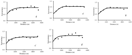 The semivariance of SOC contents (a–d) and residual data (a’–d’) at the different discretization of v1, v2, v3, and v4, respectively.