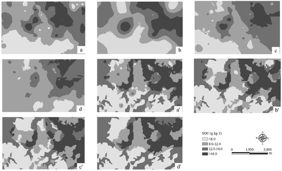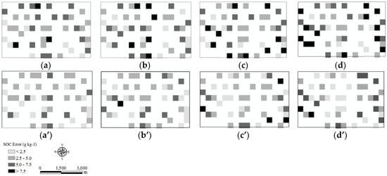 Spatial distribution of SOC content based on various sample discretization levels ((a–d) and (a’–d’) were at the discretization levels of v1–v4, respectively).