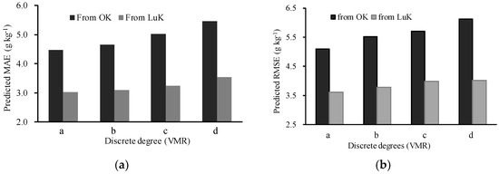 From the predicted mean MAE and RMSE values of three repetitions (Figure 5), the interpolation accuracies of LuK were higher than those of OK at four discretization levels. In addition, the predicted MAE and RMSE values obtained from the two methods both improved with increasing discretization. The MAEs of the OK method were 4.47, 4.65, 5.03, and 5.46 g kg−1 at the levels of V1–V4, respectively, and the corresponding RMSEs were 5.10, 5.52, 5.70, and 6.12 g kg−1, respectively. Compared with the errors at the V1 level (VMR = 0.12), the MAE and RMSE values at the V4 level (VMR = 2.17) increased by 22.1 and 20.0%, respectively. Similarly, the MAEs based on LuK were 3.02, 3.10, 3.24, and 3.54 g kg−1, and the RMSEs were 3.61, 3.79, 3.98, and 4.02 g kg−1 at the V1–V4 levels, respectively. Compared with the V1 level, the predicted MAE and RMSE values at the V4 level increased by 17.2 and 11.4%, respectively. The comparison results showed that the spatial discretization level of soil sampling points has an important influence on the uncertainty in SOC spatial interpolation.