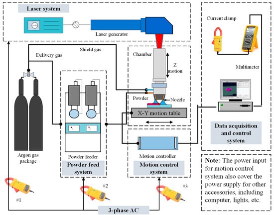 The voltage and current of power supply were measured by a multi-meter (Fluke 289) and a current clamp with 3 KHz bandwidth (Fluke i 410, Fluke Corporation, Everett, WA, USA). The collected data were processed with FlukeView Forms Software version 3.8 (Fluke Corporation, Everett, WA, USA). For each AM process, the current were measured three times for each specimen and an average value was used for SEC calculation. The process time was read off directly from the software and the volume of the specimen was measured by Archimedes’ principle. Taking LENS process as an example, the experimental set-up for the energy consumption measurement is shown in Figure 2.