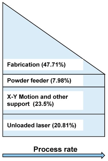 where P is the total power in kW, Pidle is the idle power in kW, v is the process rate of materials deposition in cm3/s, and k is a constant in J/cm3. Taking LENS process as an example, Pidle is the none-load energy consumption, which takes up 20.81% of the total. k is specific energy consumption (SEC) which is closely related to the materials utilized and power source. The energy consumption and distribution of LENS process is shown in Figure 3, indicating that a considerable amount of energy is needed during the startup and maintenance of the equipment, and the additional energy requirement is proportional to the process rate of materials deposition.