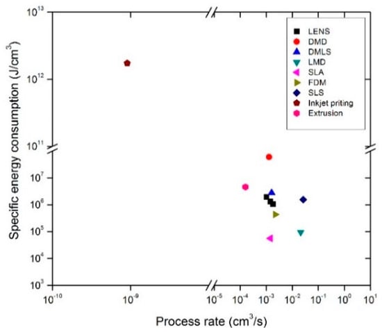 According to the data in Table 2, SEC plot for different AM processes was drawn and illustrated in Figure 4. Generally, the SEC is decreasing with the increase of process rate, and the difference of SEC for different AM processes is as much as seven orders of magnitude. Basically, the SEC of bio materials AM processes is higher than metallic materials, and the SEC of polymer material AM processes is relatively small. Apart from inkjet printing, the SEC for most of the selected AM processes presents a cluster phenomenon. For the polymer materials, it is reported that the SEC of traditional bulk forming process, such as injection molding, is about 6.01 × 103 J/cm3 [35], which is much less than that of AM processes. For the metallic material, the SEC of subtractive manufacturing processes varies greatly with the different material. The milling and turning processes of AISI 4140 steel were estimated to be 1.45 × 104 J/cm3 (milling) and 7.1~14.5 × 103 J/cm3 (turning) [36,37] respectively, which only accounts for 0.75% to that of LENS process. Therefore, the traditional bulk forming process for polymer material and subtractive manufacturing process for metallic material are more energy efficient than the corresponding AM processes regarding the SEC when the material preparation process is out of consideration.