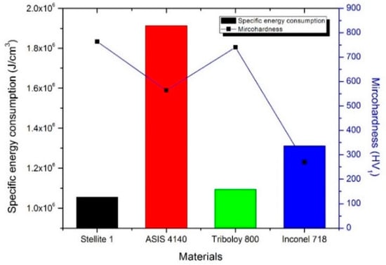 To testify the possibility that acquires desired property with less energy input, the effect of the powders on SEC and part surface hardness was examined and the result is shown in Figure 7. The block part fabricated with Stellite 1 has the highest surface hardness, followed by Triboloy 800, AISI 4140, and Inconel 718, suggesting that it is possible to select powders which can not only cause less energy consumption, but also provide a better part quality, such as Stellite 1 and Triboloy 800.