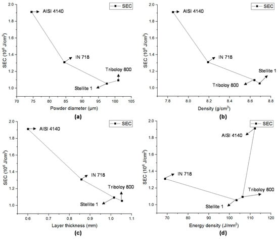 Effect of powder characteristics and input parameters on SEC: (a) Powder diameter; (b) density; (c) layer thickness; and (d) energy density.