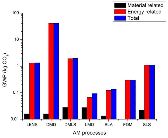 - For the environmental impact quantification, the GWP impact result of AM processes indicates that the GWP is brought about principally by the energy production process. DMD will contribute the great impact to GWP due to the high SEC, and LMD and SLA will bring about relatively less GWP than the other processes.
