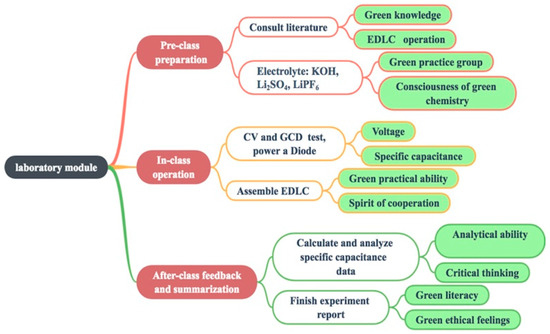 Students were involved in this experiment as a three-stage project in a first-semester undergraduate electrochemistry laboratory. The first stage (pre-class) included discussions of the principles of green chemistry, how the EDLC worked and was assembled, and how to generate cyclic voltammetry and galvanostatic charge-discharge curves with the electrochemical workstation. The second stage (in-class) allowed students to assemble an EDLC and practically test the product. The third stage (after-class) involved analyzing the test results and finishing lab reports. The process of “teaching” and “learning” in the three-stages was designed to involve experimentation, implementation, and reflection, as shown in the Supplementary Materials. Figure 1 and Figure 2 express the teaching idea, purpose, and the time arrangements of the experimental curriculum.