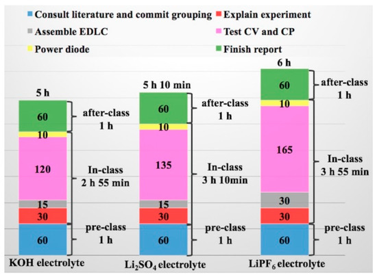 The teacher assigned tasks on a network education platform. Thereafter, the students were divided into self-selected groups of three students each to evaluate the voltage window of three electrolytes (KOH, Li2SO4, and LiPF6) and study the effects of these electrolytes on the chemical performance of the EDLC.