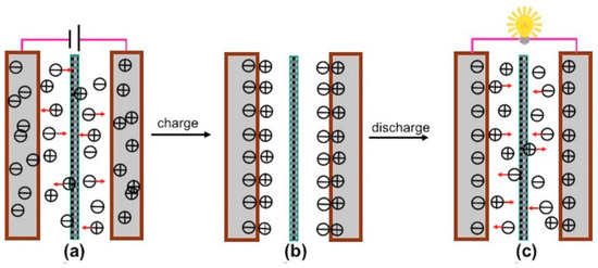 Schematic illustration of charge/discharge process in EDLC. (a) The charging process, (b) EDLC after charging, and (c) the discharging process.