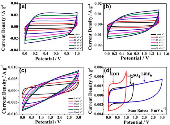 Representative CV curves of (a) KOH, (b) Li2SO4, and (c) LiPF6 electrolytes at different scan rates using a two-electrode testing setup. (d) CV curves of the three samples at a sweep rate of 5 mV s−1.