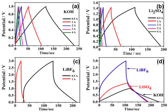Figure 6 shows the GCD curves of the KOH, Li2SO4, and LiPF6 electrolytes when measured at different current densities using a two-electrode testing system. The KOH and Li2SO4 samples exhibited symmetrical shapes and a relatively small internal resistance (IR) drop. The slight curvature in the GCD curves corresponded to the redox reaction of the active species in the sheet. In addition, the GCD curves in the LiPF6 specimen remained constant at different current densities and showed no visible IR drops.