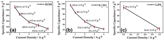 Figure 7a exhibits the specific capacitance with the KOH electrolyte was 231.4 F g−1 at 0.5 A g−1 based on Equation (1). This value was twice as much as that of the Li2SO4 electrolyte (115.4 F g−1) and four-fold greater than the LiPF6 electrolyte (55 F g−1), as shown in Figure 7b,c. At a current density of 1 A g−1, the specific capacitance of the KOH electrolyte remained as high as 205.3 F g−1 with a capacitance retention rate of 88.8%. The Li2SO4 electrolyte reduced the performance by 25.4% or 86 F g−1. The LiPF6 electrolyte exhibited a specific capacitance of 16.8 F g−1, a reduction of 69.4% under constant parameters. These data showed that the specific capacitance of the EDLC gradually decreased as the current density gradually increased, and the KOH formed an excellent electrical double layer, showing good electrode conductivity.