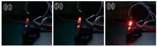 Diode brightness using (a) KOH, (b) Li2SO4, and (c) LiPF6 electrolytes in EDLC.