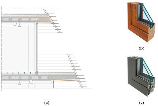 Case study: (a) cross section of the building; (b) timber window frame; (c) aluminum window frame.