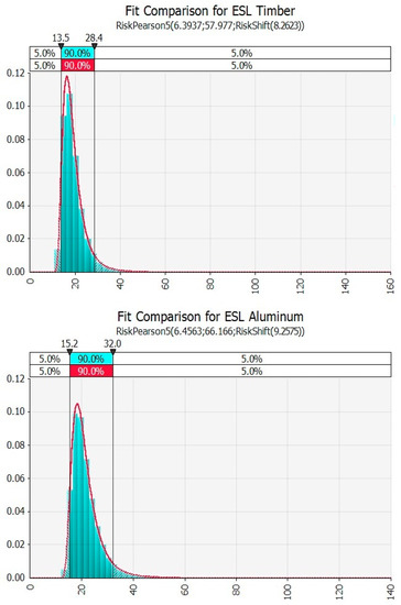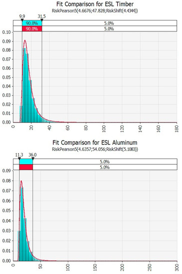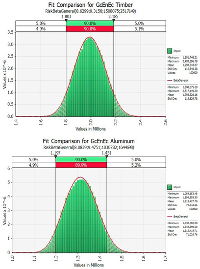 Figure 10 and Figure 11 conclude the results presentation, with the seventh step, illustrating the best-fit distribution function for the output values above. In the cases of timber frame and aluminum frame low-impact factor scenarios, and timber frame low-impact factor scenarios, the beta distribution results fit best for the stochastic global cost values. Only in the case of aluminum frame high-impact factor scenarios, is the gamma distribution preferable for fitting the values distribution.
