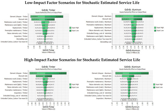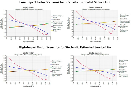 In Figure 7, for low- and high-impact factor scenarios for timber and aluminum frames, the input variables are ranked by their effect on output mean (graphically expressed through tornado graphs).