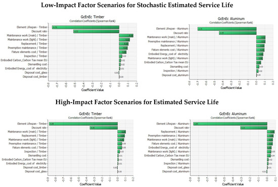 Spearman correlation coefficients, timber/aluminum frames, low/high-impact factor scenarios for stochastic estimated service life. Monte Carlo simulation output.