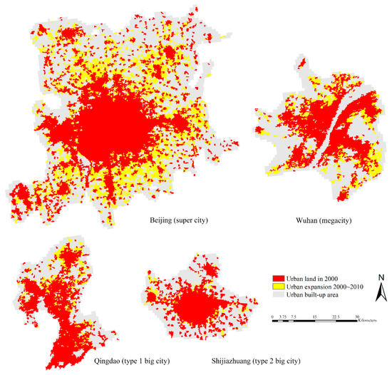 Examples of urban built-up areas and urban expansion in 2000 and 2010.