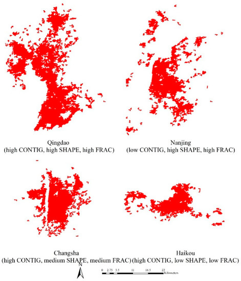 Rather than using census-defined boundaries, we utilized urban built-up areas to calculate the population density, and population data are from LandScan Population Database (ORNL) with 1 km resolution. The contiguity index (CONTIG) is used to characterize the spatially continuous level of urban lands, and discontinuous urban growth, such as leapfrog development, may fragment farmland and wildlife habitat [34]. The lowest CONTIG value equals 0 for a most discontinuous urban form and increases to a limit of 1 as urban contiguity increases. The shape index (SHAPE) represents the shape irregularity of urban lands, and irregular boundaries among suburban areas are expected to increase automotive trips, tailpipe emissions, and energy consumption [10,23]. The higher the SHAPE value, the more irregular the urban form (value ranging from 0 to 100). The fractal dimension index (FRAC) evaluates the spatial complexity (value ranging from 1 to 2), and a higher value generally indicates that urban lands are more jagged [24]. We utilized Fragstats 4.2 to calculate CONTIG, SHAPE, and FRAC metrics for each city. Examples of urban form are shown in Figure 3.
