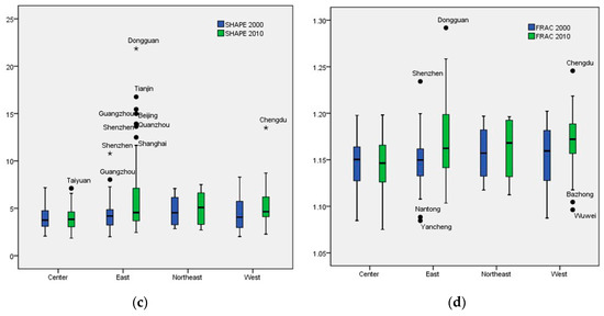 In 2000, eastern cities had the lowest contiguity index value among the four regions. On one hand, the policy of opening up brings new economic and technological development zones to the eastern area, which may have resulted in leapfrog-style development patterns. On the other hand, the separation of dense water networks, such as lakes and rivers, may have decreased CONTIG values in the eastern region. The SHAPE and FRAC values show that eastern and western cities showed greater irregularity and complexity on average than central cities. This phenomenon was much more apparent in 2010, which exhibited larger mean differences and greater significance than in 2000. For example, although the SHAPE values for eastern cities were not significantly higher than western and northeastern cities in 2010, the outliers in Figure 4 (e.g., Dongguan, Tianjin, Beijing) had much higher values. As measured by SHAPE and FRAC values, cities in the central region were the most compact. From 2000 to 2010, the increase of SHAPE and FRAC values displayed a higher level of irregularity and complexity in the urban form of Chinese cities. Both SHAPE and FRAC values increased for 55 cities (48%), with more than half of the eastern cities (28 cities, 54%), 11 central cities (41%), 12 western cities (50%), and 4 northeastern cities (33%).