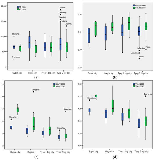 Comparing results for super cities, megacities, type I big cities, and type II big cities shows the association between urban form and city size (Figure 5). Super cities exhibited the lowest population density in 2000, even though they had the largest populations. From 2000 to 2010, urban sprawl was quite common in megacities, where the density decreased in 8 of 9 megacities. Most super cities (4 of 5) and type I big cities (11 of 20 cities) became more irregular and complex, whereas only 2 of 7 megacities followed this trend. Increases of CONTIG values show that urban form became more continuous than before. This may have been the result of new developments between urban cores and fringe areas [11]. The CONTIG values for 9 cities decreased, all of which were type II big cities. In 2010, the mean population densities of super cities and megacities were lower than those in type I and type II big cities. The boxplots for SHAPE and FRAC values show stair step-like shapes that increased with city size, and the value of these metrics for a high-level city was bigger than a low-level city. For example, the FRAC value for super cities was significantly higher than that of megacities, and the latter was significantly higher than that of type I big cities. In all, the results show that the level of complexity and irregularity increased as city sizes increased. During this period, many cities grew rapidly, along with the development of the urban economy and population [37]. Medium and large cities have accommodated most of the urban population growth, which makes super cities and megacities possible [38]. In addition, some big cities expanded their administrative areas by merging their suburban counties, thus accelerating urban sprawl.
