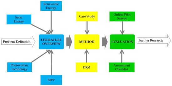 To develop the proposed conceptual framework, we proceeded by conceiving the investigation as the first stage of developing a grounded approach and thus focused on a deductive overview of the related literature; next, the development of the approach, and finally its evaluation. The literature overview was carried out on topics inherently related when considering BIPV technology, added to this section was an outline of BIPV educational barriers to set the stage for clarifying the research objective. The method section involved a combination of case study methodology with the Design Research Methodology (DRM) by Blessing and Chakrabarti [43]. This section also adapted principles from [44,45] to justify the procedure applied, and was framed to synthesize core requirements to aid the proposed design. Finally, we evaluated the developed approach in line with DRM principles. This was done using a pilot study on potential BIPV clients, and a checklist deduced from existing literature to verify if the approach meets both “market” and “research” expectations respectively. Figure 1 below shows the various stages of the research design with color codes for the respective steps; blue for the literature background, yellow for the method section and green for the evaluation section of the investigation.