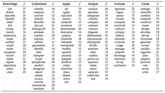 The verbs of Bloom’s taxonomy of knowledge, understanding, application, analysis, synthesis, and evaluation, as presented by Stanny []. These verbs were used as support for the analysis.