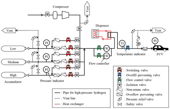 To efficiently fill hydrogen into the FCV, three different accumulators are employed in terms of the pressure: A high-pressure tank, a medium-pressure tank, and a low-pressure tank. First, the FCV tank is pressurized to 65 MPa using the low-pressure tank. The filling tank switches from the low-pressure tank to the medium-pressure tank by switching the valve. Second, the FCV tank is pressurized to 75 MPa using the medium-pressure tank. Finally, the FCV tank is pressurized to 80 MPa using the high-pressure tank. When the pressure in the FCV tank reaches 80 MPa, the filling-selector valve closes and the filling is completed. While the FCV is being filled using the accumulator, hydrogen is charged from the compressor to the accumulator, and each tank is pressurized to 82 MPa in the following order: The low-pressure tank, the medium-pressure tank, and the high-pressure tank. Because the pressure difference between the high-pressure tank and the FCV tank is small, it is impossible to boost the FCV tank. Thus, toward the end, the hydrogen is directly pushed from the compressor to the FCV tank.