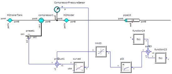 Figure 4 shows the model of compressor in the Simulation X. The discharge flow rate of the compressor is 1200 Nm3/h, which is maintained at a constant regardless of the pressure at the inlet and outlet sides by providing feedback control to the rotation speed of the compressor. The pressure of the hydrogen trailer, which is the suction pressure of the compressor, is 45 MPa, which is increased to 85 MPa using a compressor. When the internal pressures of all the accumulators fall below 82 MPa, the switching valve between the compressor and the accumulator opens automatically and the compressor sends compressed hydrogen to the accumulator. Subsequently, the valve closes when the pressures in all the accumulators reach 82 MPa.