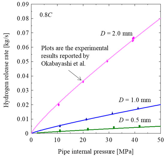Figure 8 shows the simulation results for leakage diameters of 2, 1, and 0.5 mm. In the leakage model, the initial internal pressure of the pipe was set to 50 MPa. These are the results obtained by multiplying the sonic conductance by 0.8. The plots in Figure 8 show the experimental results for leakage diameters of 2, 1, and 0.5 mm [16]. The hydrogen-release flow is obtained for pipe internal pressures of approximately 40, 30, 20, and 10 MPa. As shown in Figure 8, it was found that the simulation results are in good agreement with the experimental results as in the case of the subsonic flow. We chose the sonic conductance as 0.8 times the theoretical value to reflect the influence of the pressure loss due to the shape of the nozzle. Thus, the hydrogen-release flow was estimated using the model wherein the theoretical value of the sonic conductance is multiplied by 0.8. In this model, the simulation result was verified to be in good agreement with the experimental result of the hydrogen behavior for a pipe internal pressure of 50 MPa, but it was not verified for a pressure of 50 MPa or more.