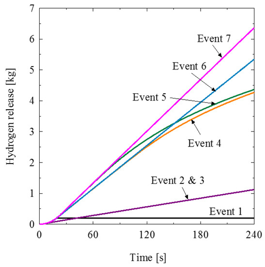 The amounts of hydrogen released in the events, 1–7, were calculated by simulating the physical model, which is given in Section 2. In the simulation, the amount of hydrogen released in 240 s was calculated. Figure 11 shows the hydrogen-release behaviors of the events, 1–7.